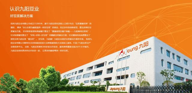 杭州九阳豆业有限公司成立于2005年,源于九阳豆浆机发明人王旭宁先生“豆浆健康世界”的情怀, 秉承“全心全意为顾客提供一杯好豆浆”的使命,经过多年的创新研发,推出多种好豆浆解决方案。 针对财政食堂和高端餐厅推出了“健康食堂及餐厅标配——九阳商用豆浆机”;针对快捷餐饮推出了 “好机+好料=好豆浆”的精磨豆浆解决方案;针对潮流时尚消费推出了即饮豆浆九阳豆浆“磨豆匠”。 好豆浆,九阳做!九阳豆业是好豆浆解决方案的专家。 杭州九阳豆业有限公司拥有东北非转基因优质大豆种植基地和大豆深加工基地,打造了九阳豆浆全产业链优势平台。 目前,九阳豆浆拥有300多家合作伙伴,服务网络覆盖全国260个大中城市。九阳豆业将和更多的合作伙伴一起, 让更多的顾客喝到一杯好豆浆。