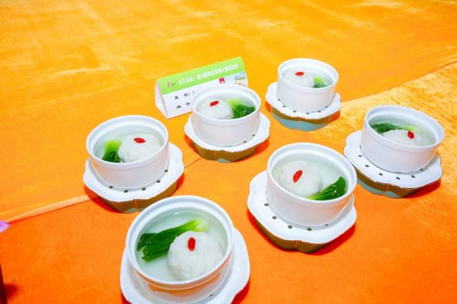 江苏小厨娘餐饮管理有公司行政总厨刘峰展示了酸汤珍珠鱼丸、狮子头佛跳墙。